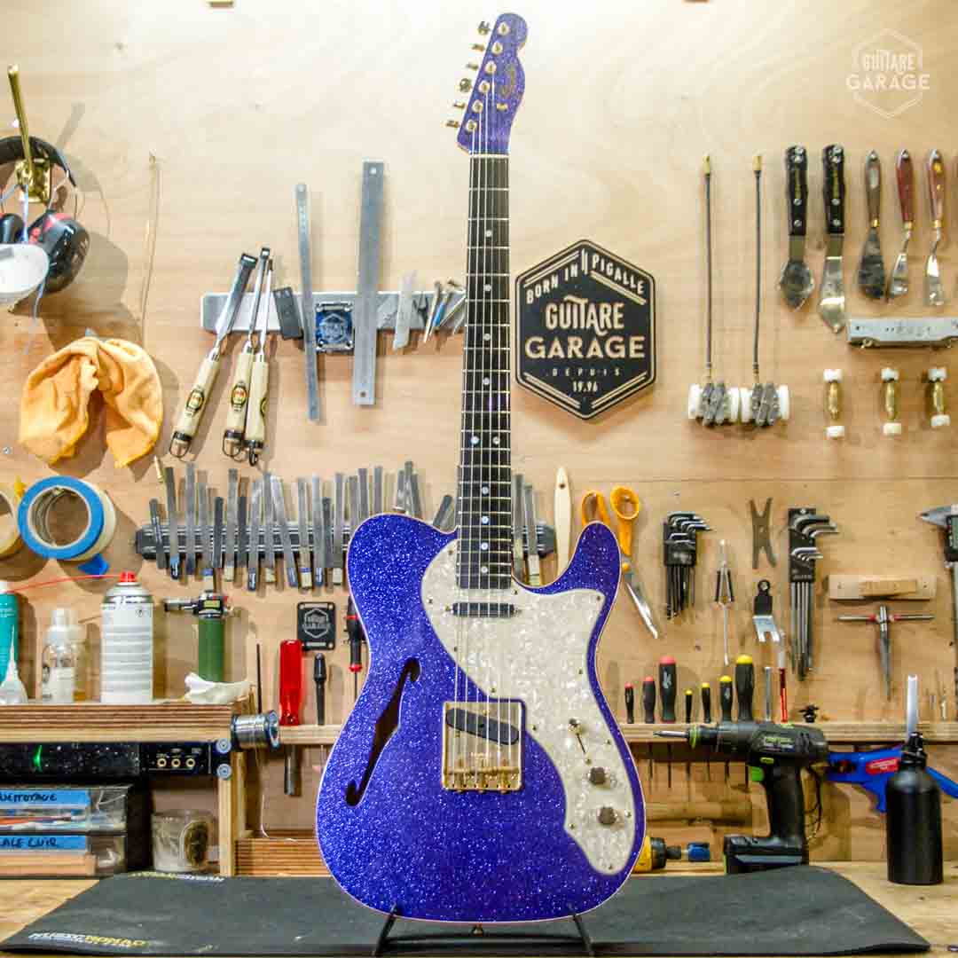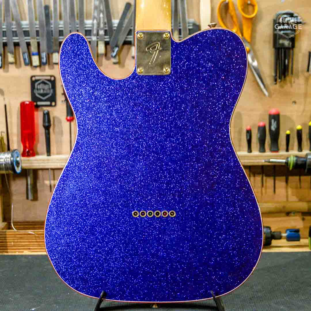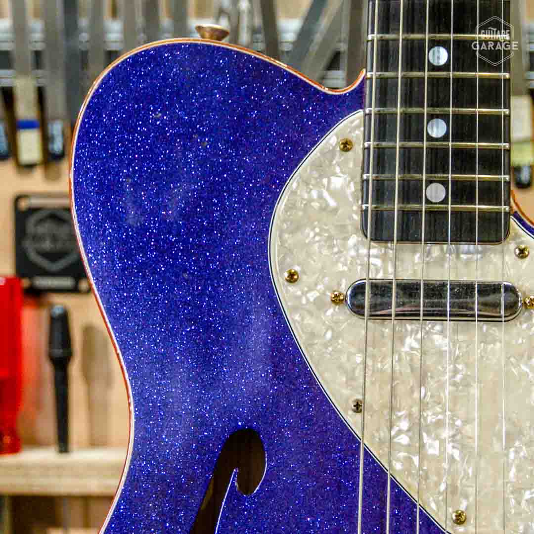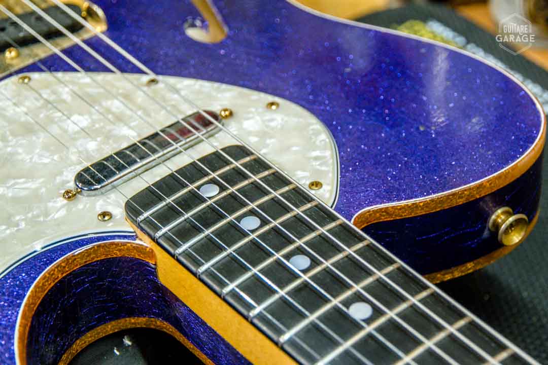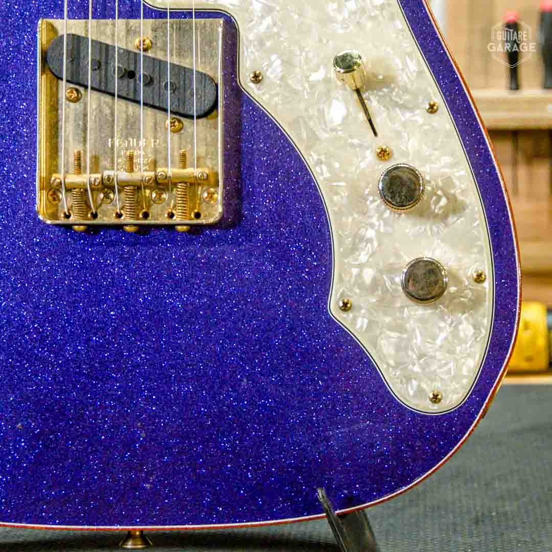 Cette Occasion du Garage est une exceptionnelle Fender Custom Shop Masterbuilt modèle « 69 Telecaster Thinline » de 2018 assemblée par le célèbre MasterBuilder John Cruz connu pour la qualité de ses guitares et qui a depuis quitté le Custom Shop pour fabriquer ses propres guitares. Cette guitare a un look spectaculaire avec sa finition Purple Sparkle, un matching headstock et un corps orné de double bindings gold sparkle. La guitare est aussi très légère et résonnante et délivre un son superbe.