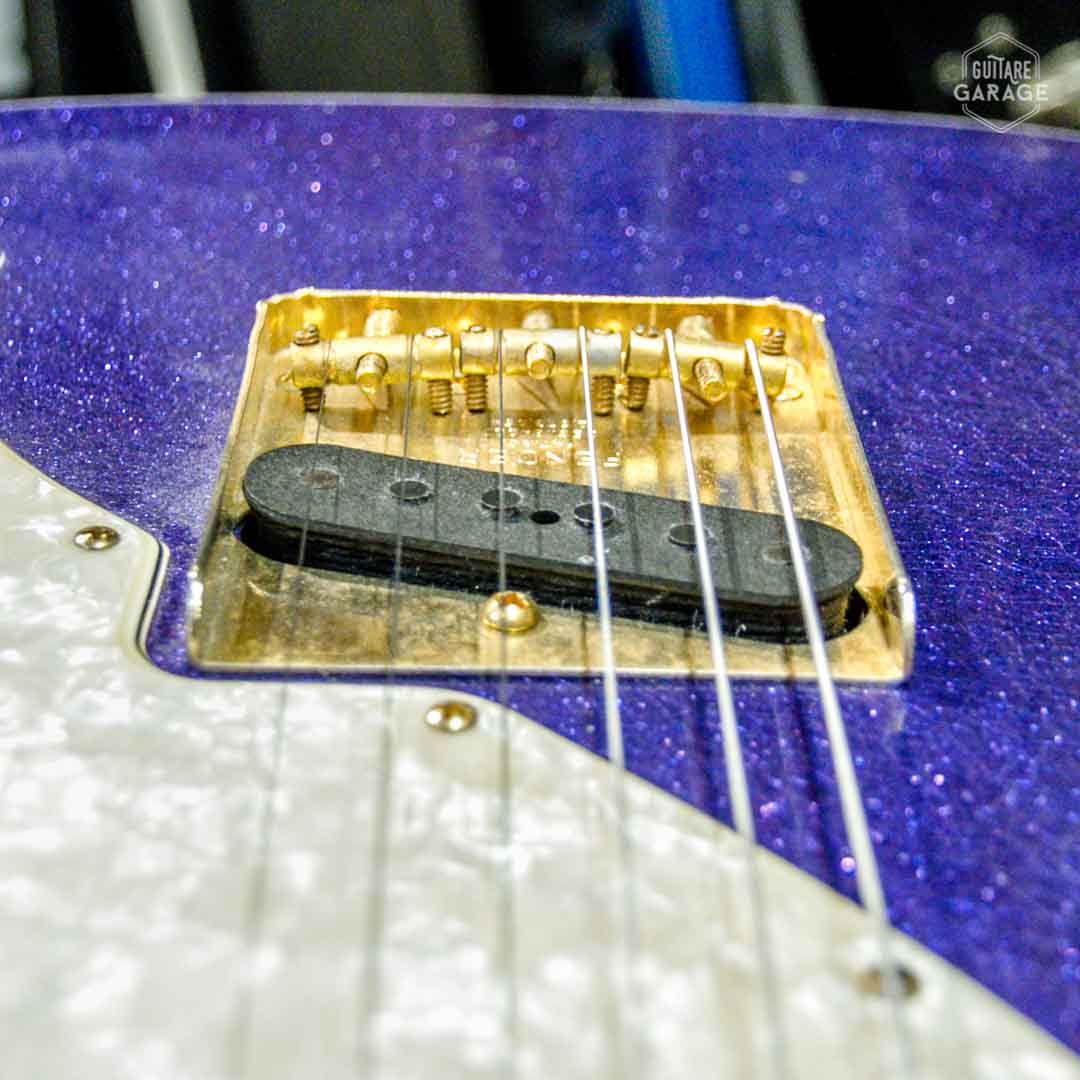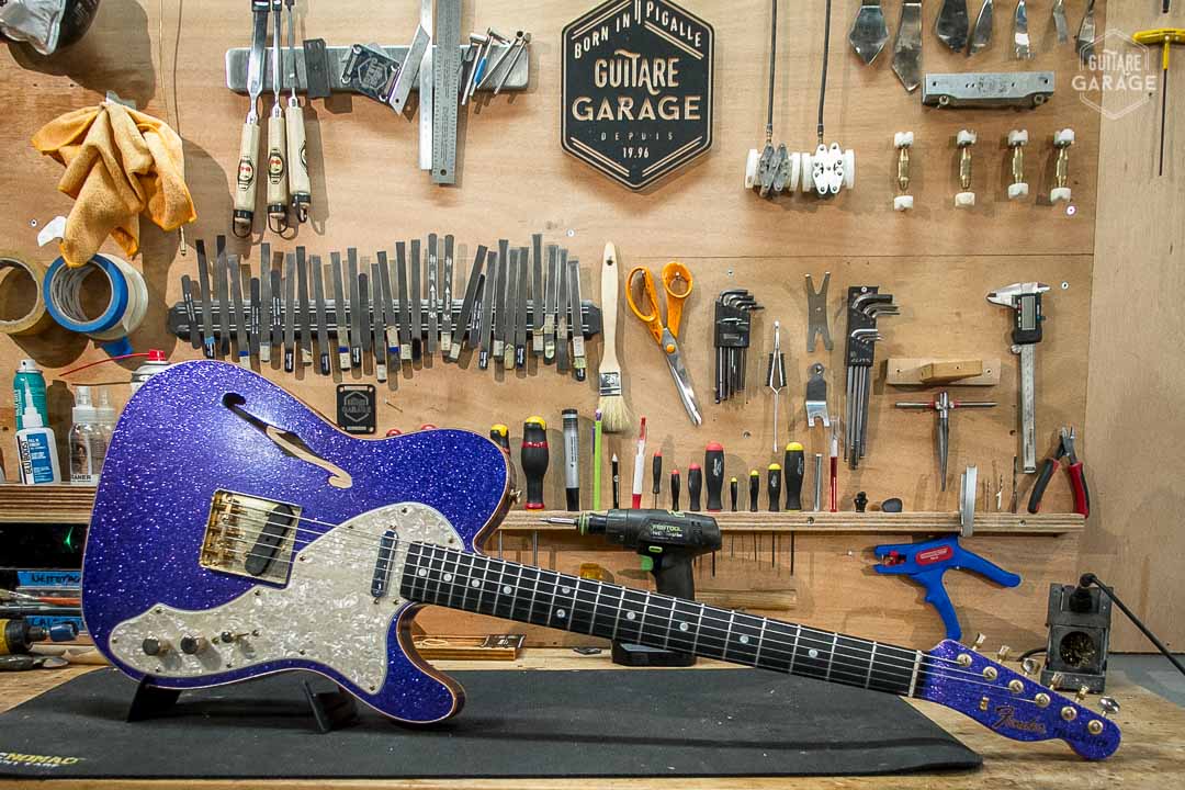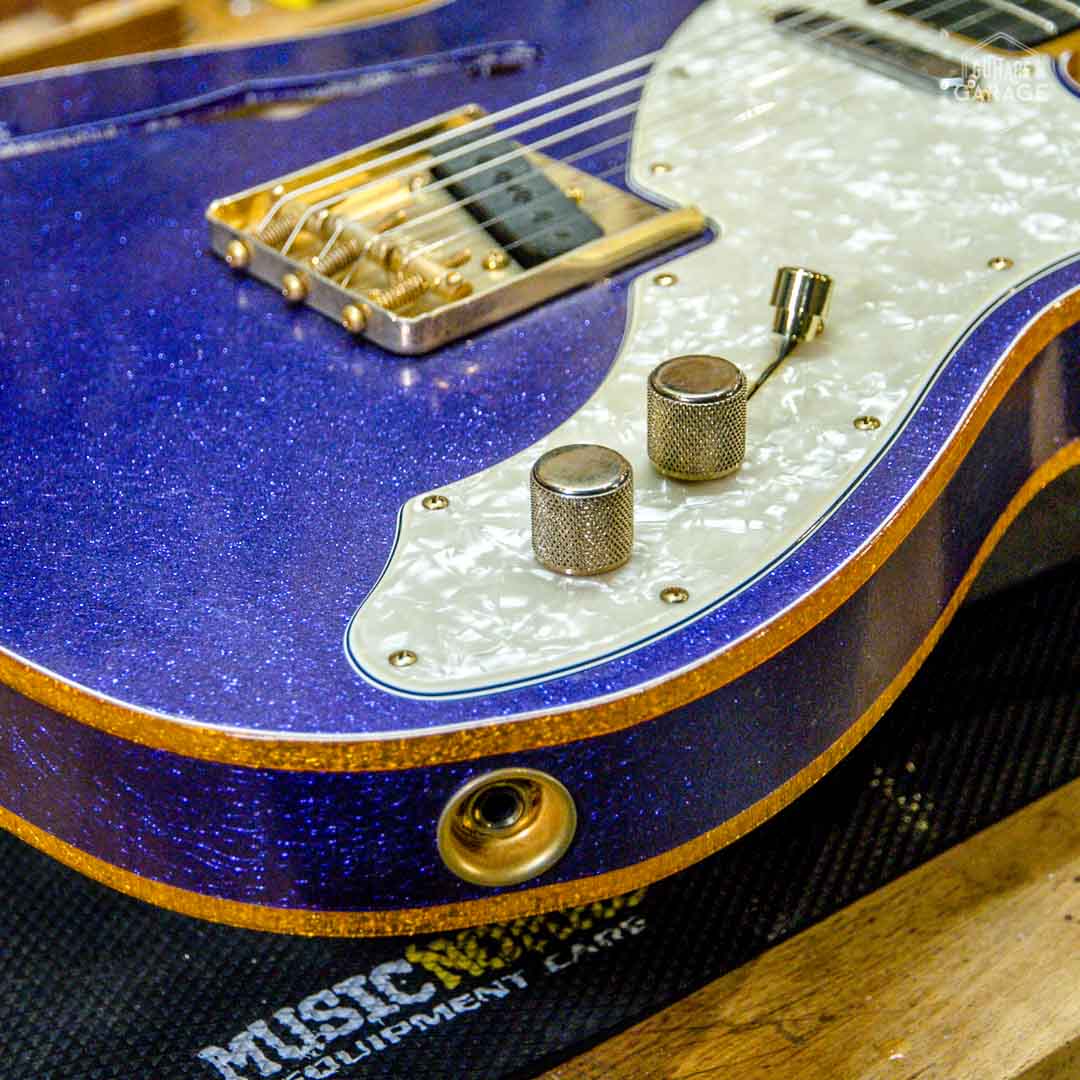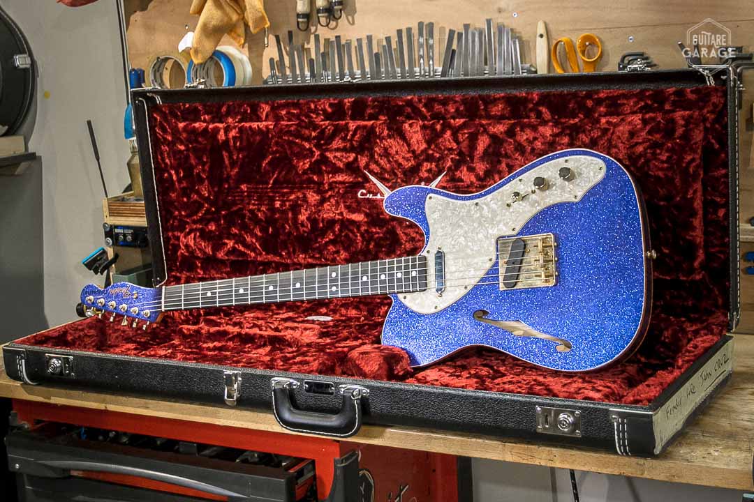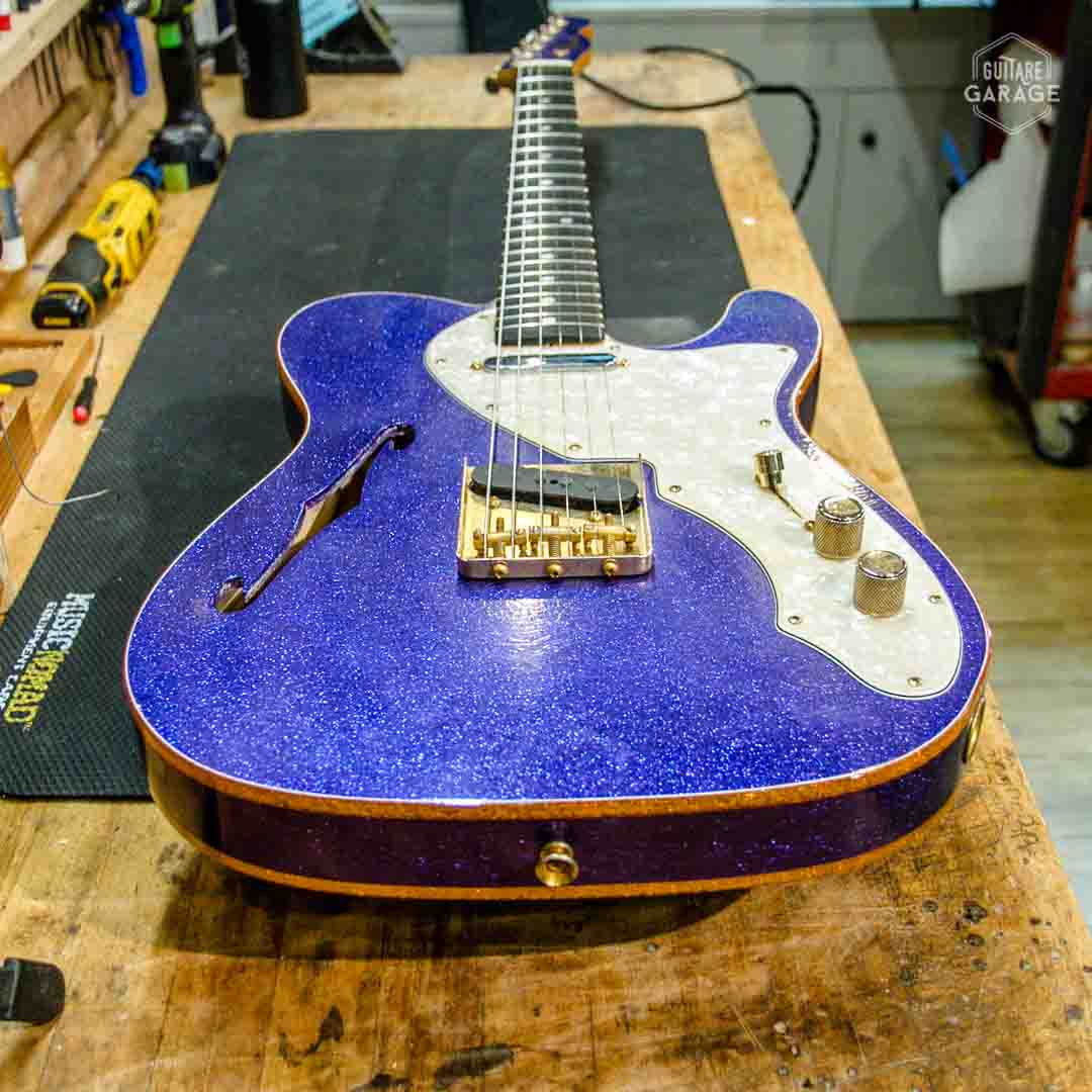 Cette Occasion du Garage est une exceptionnelle Fender Custom Shop Masterbuilt modèle « 69 Telecaster Thinline » de 2018 assemblée par le célèbre MasterBuilder John Cruz connu pour la qualité de ses guitares et qui a depuis quitté le Custom Shop pour fabriquer ses propres guitares. Cette guitare a un look spectaculaire avec sa finition Purple Sparkle, un matching headstock et un corps orné de double bindings gold sparkle. La guitare est aussi très légère et résonnante et délivre un son superbe.
