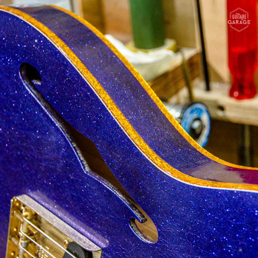 • Corps en Frêne type hollow body orné de superbes double bindings Gold Sparkle