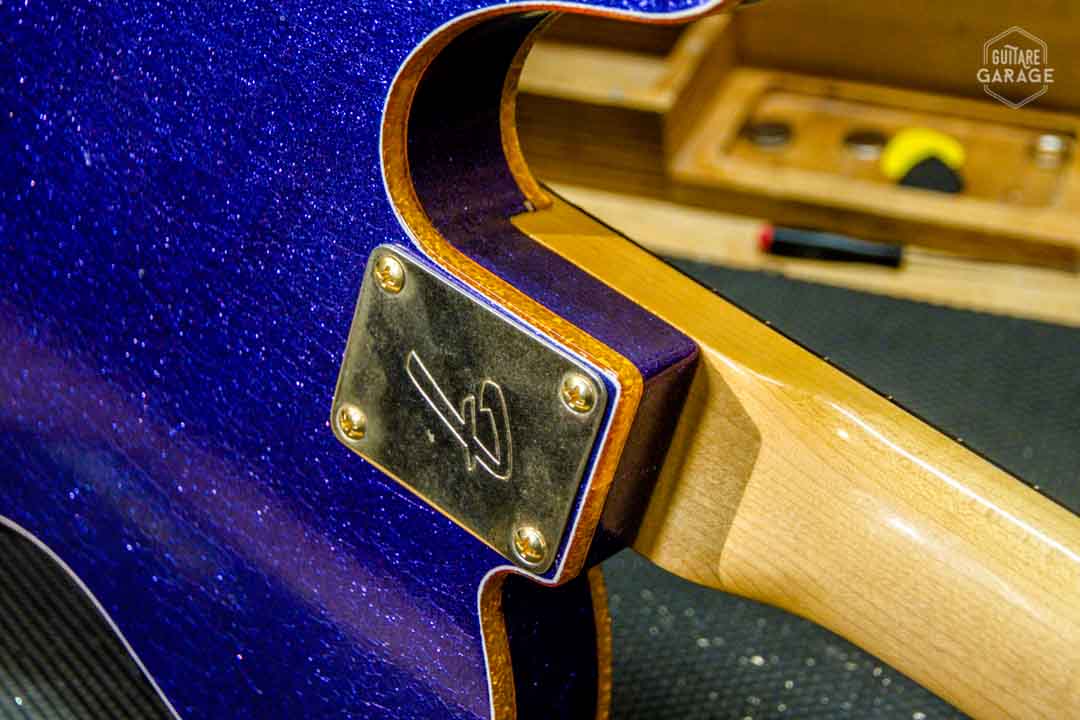 • Manche en érable avec touche en ébène, profil « 1960 Oval C » incroyablement confortable, 21 frettes type Fender vintage, radius 7.25″ et dots mother of pearl. Le manche est fini en nitro cellulosique avec un matching headstock purple sparkle.